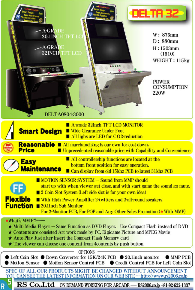 The Delta 32's main features are the optional dual-monitor setup, charge card pay system (no coins required), and motion sensor attract sound on/off. It is available in black and white. Uses Sega standard control panels (Astro) for easy and low cost replacement. Video Delta 32